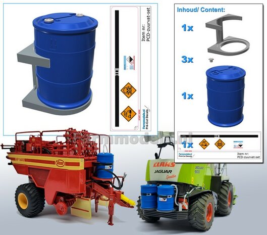 Acid barrel + Hanging frame + loose caps Material: RESIN , whereby the acid barrel and the caps are supplied in color (MATT BLUE & WHITE), and the FRAME in RESIN to be painted in the desired color yourself 1:32 This set consists of: 1x Acid barrel 3D printed Resin MATT BLUE Delivered sprayed 3x closing cap for acid barrel 3D printed Resin WHITE Delivered sprayed 1x Hanging frame for placing acid barrel 3D printed Resin 1x Pré-Cut decals pre-cut stickers for warnings on acid barrel 1x Pré-Cut decals pre-cut black tension strap sticker for securing acid barrel Please note: These items are 3D printed in-house. You must post-treat the FRAME yourself. (The acid barrel with the caps are already colored in this set!!) Just run it over a piece of sandpaper to sand off the "support" points of the 3D printing. Can then be sprayed in the desired color. We recommend spraying a plastic Primer first, and then the lacquer. In order to best approximate the color of the Vicon HP 1600 issued by the LCN / manufacturer MarGe models, we have not chosen our Vicon red, but we recommend our Krampe red for this one. Associated & related items etc. can be found to the right of the images under the heading "Complete your purchase" In short, a traditional Dutch product, produced and processed in the Netherlands. View full description ds.