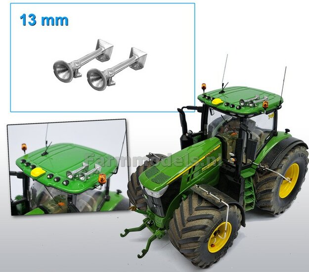2x Air horn Length 13 mm 3D printed item CHROME (manually applied) Version: Front ROUND Back square 1:32 Please note: Items are manually sprayed chrome. This chrome reacts with skin contact, and therefore becomes slightly dull. Not easy to see, but on all digital cameras today it is. If you want an air horn that always remains Chrome, we have made the sets of machine-milled, turned and tumbled air horns from surgical steel, for the real shine effect.