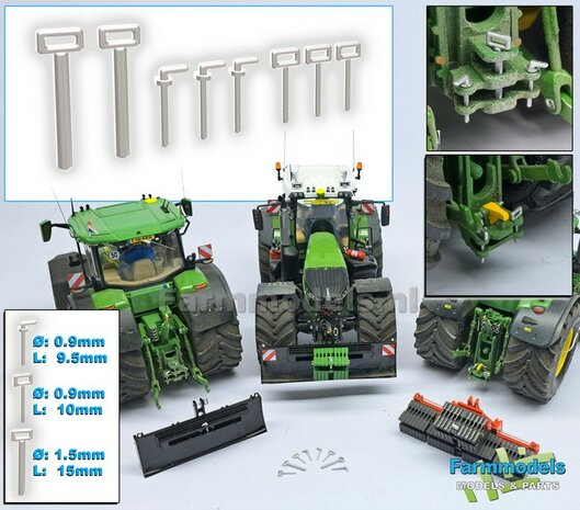 8x detailed tow bar pins. Assortment consists of: 2x thicker tow bar pins with handle eye dimensions approx. Ø 1.5mm x Length 15mm. 3x thinner tow bar pins with handle eye dimensions approx. Ø 0.9mm x Length 10mm. 3x thinner tow bar pins with handle rod dimensions approx. Ø 0.9mm x Length 9.5mm. suitable for almost all tow bars, machines etc. 1:32 In-house 3D printed items, treated and sprayed in Aluminum gloss delivered, ready for immediate use. These pins complete your model. Please note, these are 3D printed and especially the thinner ones cannot withstand the load of a brass pin, but we are also completely convinced, it completes the model!! If desired, easy to shorten yourself. s...